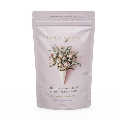 Treat Yourself xx Rose Essential Oil Mini Bath Salts 150g contains classic rose essential oil that is hand-blended through organic sea salt for a relaxing and aromatic self-pampering treat.