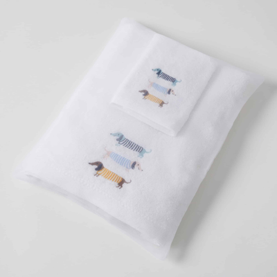 Use this Dachshunds baby bath towel and face washer set in the nursery for bub’s first bath and beyond! The super soft absorbent cotton towelling is gentle on the skin and features intricately embroidered dachshunds in teal, blue and gold.