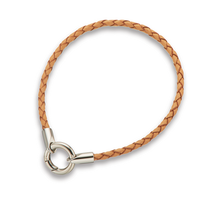 This stunning natural woven leather bracelet is the perfect basic for casual everyday wear. It is 4mm in diameter and 21.5cm in length with a stainless steel open able ring clasp. Add your favourite charms by simply opening the stainless steel ring clasp and sliding the charms onto the band. Create the perfect gift for any occasion by personalising this bracelet with handpicked charms, a small grouping of our solid sterling silver, bronze, copper and brass designs will shine when worn on this fine plaited leather. Whether stacked with other bracelets, leathers and bangles or styled solo for a more minimalist look, this timeless bracelet will be a guaranteed favourite. Colours may vary slightly between batches.