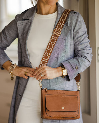 The Louenhide Lizzie Tan Crossbody Bag is stylish, practical and spacious enough to fit your essentials and more. The Lizzie features two slip pockets, one zip pocket and a front side magnetic clasp slip pocket. Take this versatile bag day to night by styling your way, with a choice of a contrast guitar strap or slim extension strap. The front pocket of the Lizzie Crossbody can fit up to an Iphone 13 Pro Max inside.
