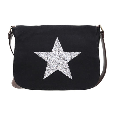 External Features: Encrusted large star in clear crystals on front flap of bag. “Antique” look PU Strap with same PU used on zip facing. Back zip pocket with matching zip.