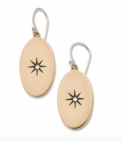 Shiny bronze oval earrings with a star cut engraved in the centre and a Swarovski crystal in each star. The Cosette earrings have sterling silver hooks and a 25mm drop. These earrings allude to the timeless elegance of the Parisienne woman and can be worn as a set with the Clair de lune necklace and Helene ring or on their own. The Cosette earrings complement all necklaces and bracelets within the Parisienne collection and can also be worn with any of our other designs in the Palas collection.
