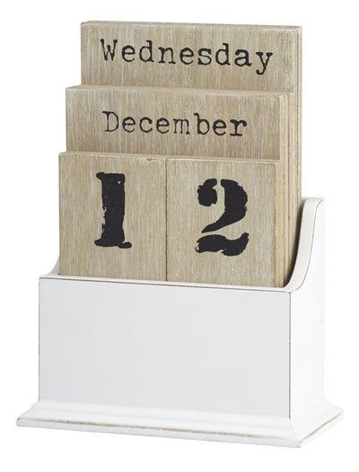 The wood-toned tiles can be easily rotated to display the current day, month and date within the elegant white display stand.