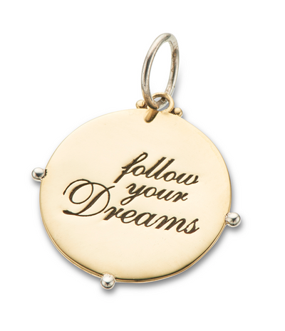 Sterling silver and brass round medium charm engraved with 'follow your dreams' and has silver dot detailing around the frame.This beautiful inspirational charm is the perfect way to send a gift of positivity to uplift someone special in your life and remind them to never stop following their dreams. A daily reminder of the endless possibilities out there and to keep working towards great successes. Gift this charm to someone embarking on a new venture or for a heartfelt present so that they will always be reminded to trust in themselves.