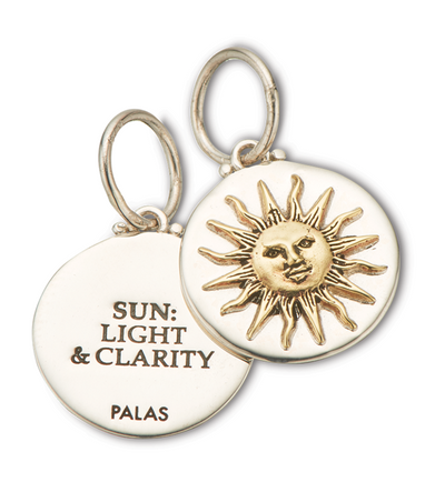 The golden sun charm is a small handcrafted sterling silver charm with raised brass detailing measuring 16 x 16mm. Our silversmiths have hand carved a beautiful sun illustration to create this dainty design. The back of the charm is engraved with the golden sun's spiritual meaning 'sun: light & clarity'.