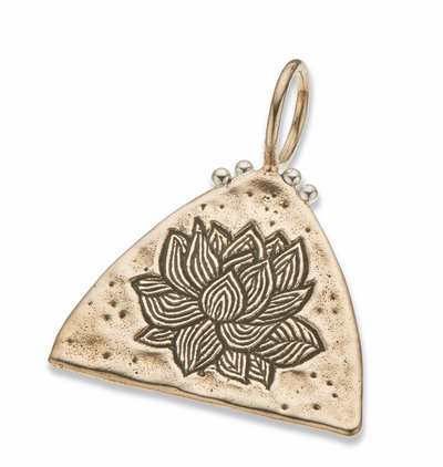 The lotus charm is handcrafted in bronze with sterling silver granulation detail in a large size measuring 25 x 20mm. Our silversmiths have hand carved this customised illustration by Indigo Buck to create this beautiful design in a unique organic triangle shape. This charm is part of our Boho Goddess Byron Bay Collection inspired by our designer Anna's love of Byron Bay. Wear this charm elegantly on a simple silver or gold chain or layer it for a more Boho look on any of our natural leather bracelets and lariats. Wear a few of the charms from the Boho Goddess Collection on different length chains to create a golden layering of necklaces that can be worn every day.