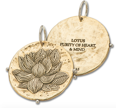 The lotus charm is handcrafted in brass with a sterling silver bail, a large size 30 x 30mm. Our silversmiths have hand carved this customised illustration by Indigo Buck to create this serene and detailed design. On the back of the charm is engraved 'Lotus purity of heart & mind'. A lotus has special meaning to followers of the Hindu religion as it is associated with a number of their deities and is used to represent divine beauty and purity, while the unfolding of its leaves represents the expanding of the soul and spiritual awakening.This charm is part of our Boho Goddess Byron Bay Collection inspired by our designer Anna's love of Byron Bay. Wear this charm elegantly on a simple silver or gold chain or layer it for a more Boho look on any of our natural leather bracelets and lariats.