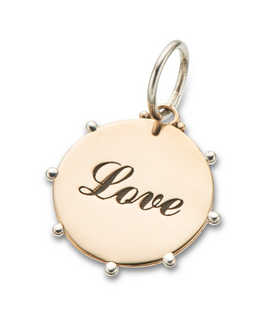 Sterling silver and bronze medium round charm with a sterling silver dot detailing. Engraved with 'Love' It is the perfect gift for any of your loved ones whether as a memento of love or friendship for an anniversary gift, birthday present or honouring life's milestones. This beautiful feature piece adds an element of love to any collection and layers perfectly with other Palas charms. It will certainly be a treasured piece in anyone's collection and be worn as a daily reminder of your love, respect and affection for them.