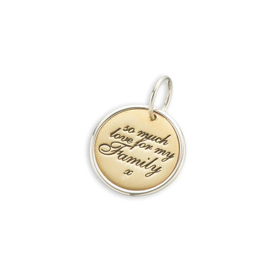 So much love family charm is 18 x 18mm in size and is handcrafted from solid brass with a sterling silver frame and bail.