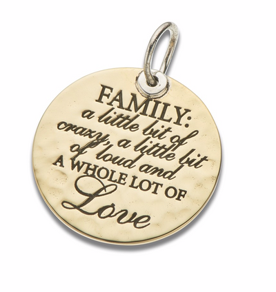 A light hearted and loving charm with the words 'Family: a little bit of crazy, a little bit of loud and a whole lot of love' engraved on a solid brass disc with a sterling silver bail. This charm would be a treasured piece for any grandmother, mother or daughter to wear or be gifted. Add this charm to her existing Palas collection or start creating a new charm bracelet or necklace with other family or love charms. Create an even more personalised piece from the whole family by adding her initial charm or the initials of her children and/or grandchildren.