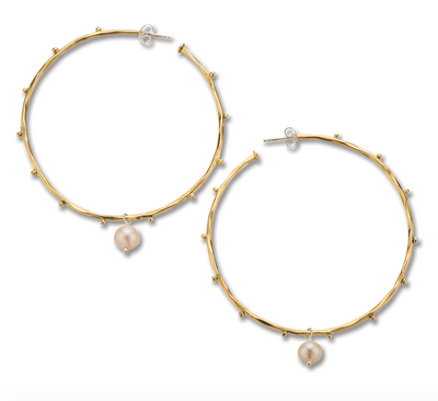 These pearl hoop earrings are handcrafted from a white freshwater pearl on a brass hoop with dot detailing around the outer. They are part of the 'the world is your oyster' pearl collection that was designed as a reminder that the world, in all of its natural beauty, has physical and spiritual gifts that it presents to us each day, we just need to be open and grateful enough to see and receive them. These are natural freshwater pearls and should not be submerged in water, chlorine, or exposed to perfumes, chemicals, cosmetics and creams as they will damage the pearl's surface and natural shine. Wipe pearls with a soft cloth after use and store in your Palas pouch.