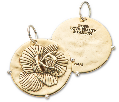 The Rose charm is handcrafted in brass with a sterling silver bail and outer dot detailing, a large size charm measuring 30 x 30mm. Our silversmiths have hand carved this customised illustration by Indigo Buck to create this beautiful design. The back of the charm is engraved with the flowers spiritual meaning 'Rose: Love, Beauty & Passion'. This charm is part of our Botanicals Charm Collection and can be worn elegantly on a simple gold or silver chain or layered with other Palas charms to create a unique piece.