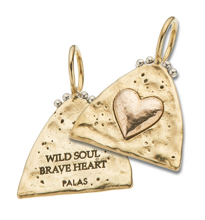 The sweet heart triangle charm is handcrafted in brass and bronze with sterling silver granulation detail in a medium size measuring 20 x 18mm. Engraved on the back of this charm are the words 'Wild soul brave heart' to remind the wearer to celebrate her wild soul and rely on her brave heart. This charm is part of our Boho Goddess Byron Bay Collection inspired by our designer Anna's love of Byron Bay. Wear this charm elegantly on a simple silver or gold chain or layer it for a more Boho look on any of our natural leather bracelets and lariats. Wear a few of the charms from the Boho Goddess Collection on different length chains to create a golden layering of necklaces that can be worn every day.