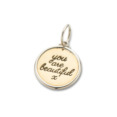 Handcrafted silver and brass medium sized round charm engraved with the wording 'You are beautiful'. This charm is the perfect way to spoil your besties or girlfriend to show them how much they mean to you. The perfect present for the special people in your life who are so beautiful and may not always see that. This sweet and sentimental charm will be a much-loved piece in their collection and always be worn close to their hearts as a celebration of self-love and appreciation.