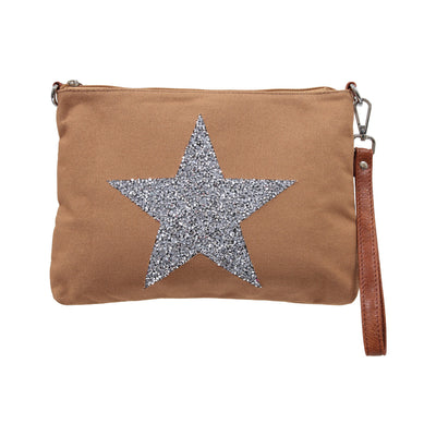 External Features: Large encrusted star on front of pouch/ wristlet. All colours are clear and strong. PU used on wrist strap is “antique” brown. New cross body webbing strap is thicker with PU trim.