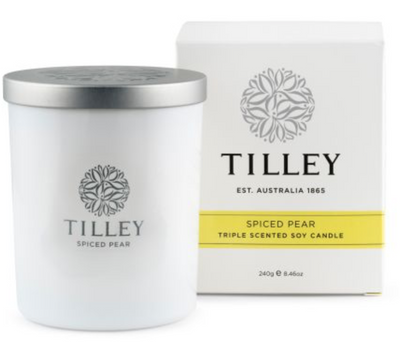 Tilley’s Spiced Pear Soy Candles are carefully hand poured and crafted to the highest quality standards. Made from premium blended soy wax and lead-free cotton wick, this spiced pear triple scented soy candle will burn cleanly for up to 45 hours. The classic Tilley white glass container adds an elegant ambiance to any decor. Please refer to inside the lid of the box for Candle Burning Instructions.