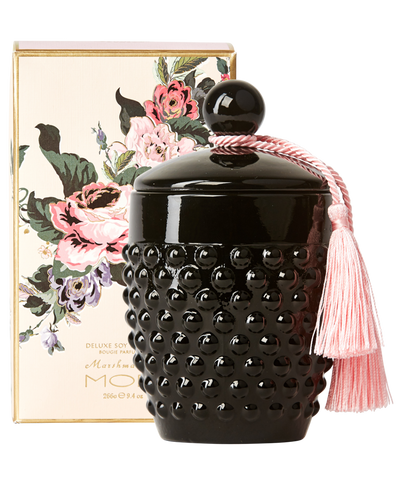 A luxury home fragrance, this exquisite candle features a black hobnail glass vessel, pink Soy Wax and is embellished with a Marshmallow tassel. Perfect to perfume the air with a signature scent and add style to any space.